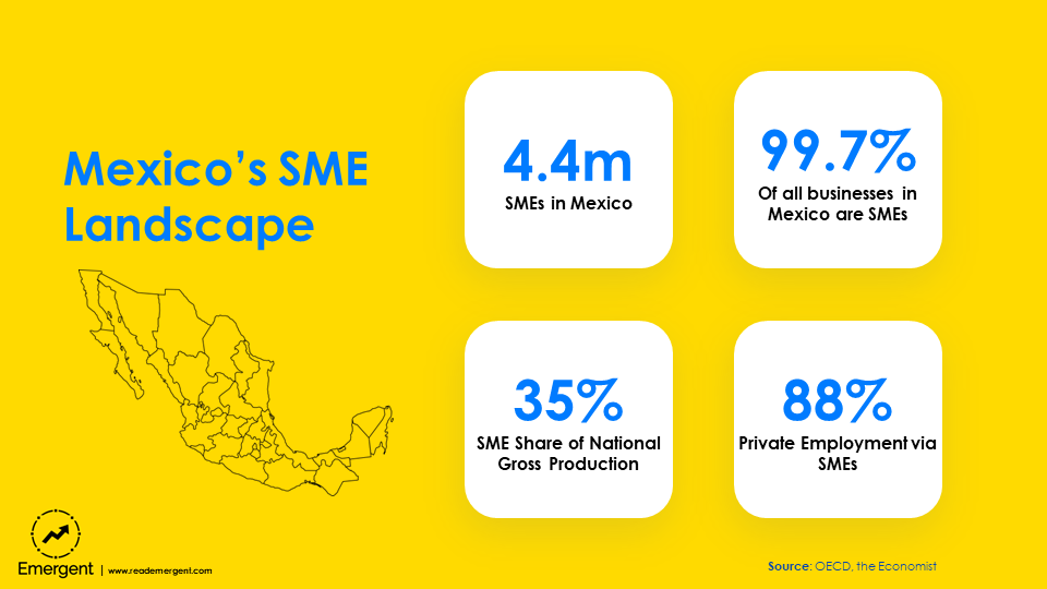 There are over 4.4 million MSMEs in Mexico that are underserved by the traditional banking system due to their size, informal nature, lack of credit history or the lack of ability to meet profitability requirements. While SMEs account for 99% of businesses in Mexico, they represent only 9.1% of all the loans disbursed. This is equivalent to just 3.7% of the Mexican GDP, compared to the 7 - 10% SME loan disbursement in other economies of Latin America.